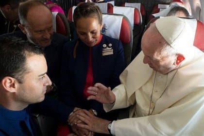 რომის პაპმა ფრანცისკემ თავის პირად თვითმფრინავში ბორტგამცილებლების წყვილს დაწერა ჯვარი.