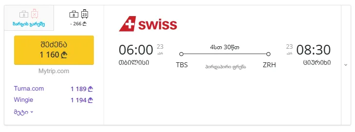 💡 ყურადღება: შესაძლოა ზემოთ მოცემული ფასების ცხრილი არ იყოს ბოლომდე განახლებული. TBS → ZRH მიმართულებით მიმდინარე, ყველაზე იაფი ავიაბილეთების სანახავად, გთხოვთ გადახვიდეთ ამ ბმულზე →