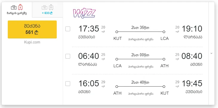 2. ქუთაისი - ლარნაკა - ათენი - ქუთაისი