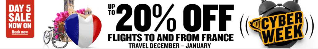 ირლანდიური დაბალბიუჯეტური ავიაკომპანია რიანაირის შემდეგი ფასდაკლება, ავიაბილეთები საფრანგეთის მიმართულებით ან პირიქით 20% ფასდაკლებით. შეიძინე ავიაბილეთი დღეს და იმოგზაურე 20% იაფად.