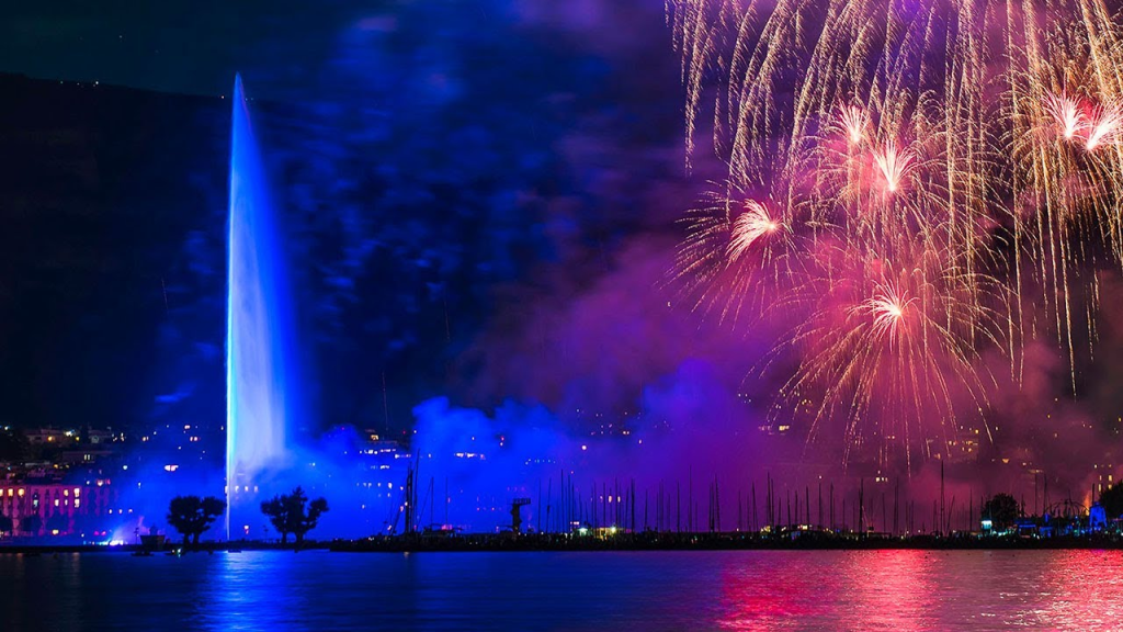 - 🎆 გრანდიოზული ფოიერვერკი ჟენევის ტბაზე (Lac Léman), რომელიც ალპების ფონზე იშლება.
