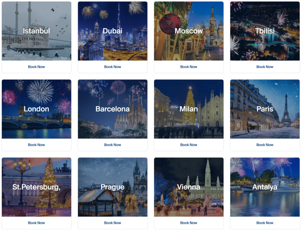 სტამბოლი დუბაი მოსკოვი თბილისი ლონდონი ბარსელონა მილანი პარიზი სანკტ-პეტერბურგი, პრაღა ვენა ანტალია ტრაპიზონი ანკარა იზმირი თელ-ავივი მალდივები უფა მინერალნიე ვოდი ალმათი ბათუმი ასტრახანი მახაჩკალა ნოვოსიბირსკი ჯედა მინერალნი ვოდი პეკინი ეკატერინბურგი ასტანა ტაშკენტი სამარა სოჭი გროზნო რიადი აქტაუ კიშინიოვი დამმამი