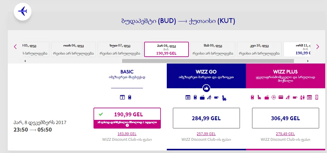 8 დეკ: ბუდაპეშტი - ქუთაისი (163₾ WDC კლუბის წევრებისთვის, 190₾ კლუბის წევრობის გარეშე)