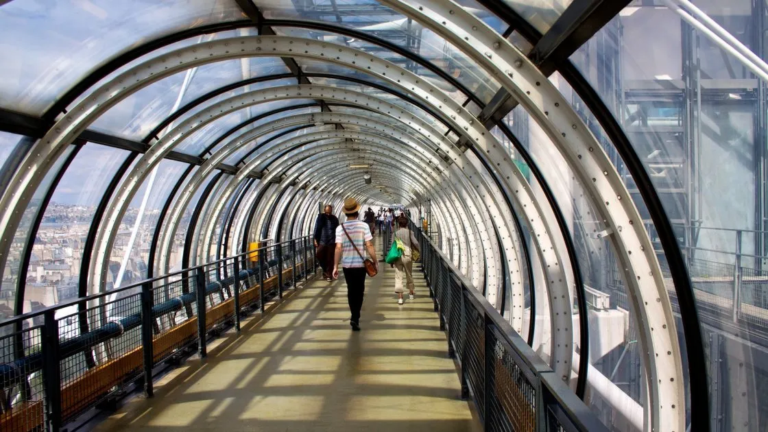 თუნდაც თქვენი შვილები ჯერ პატარები იყვნენ თანამედროვე ხელოვნების ნიმუშებით აღფრთოვანებისთვის, მაინც ღირს ცენტრში მოსვლა. ყველა კომუნიკაცია გარეთაა გამოტანილი და სხვადასხვა ფერითაა შეღებილი: ლურჯი - კონდიცირების სისტემა, ყვითელი - ელექტროენერგია, მწვანე - წყალმომარაგების სისტემა, წითელი - ესკალატორები და ლიფტები. ზედა დონეზე სათვალთვალო მოედანია, საიდანაც პარიზის ულამაზესი ხედი იშლება, მათ შორის ეიფელის კოშკზე. აქ მოხვედრა მუზეუმის ბილეთით ან ან ცალკე ბილეთით შეგიძლიათ.