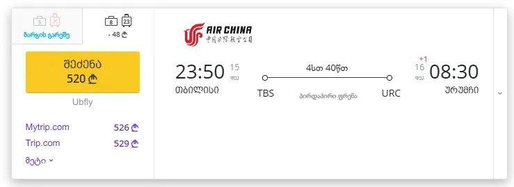 ფრენების განრიგი თბილისიდან ურუმჩის მიმართულებით ყოველდღიურად