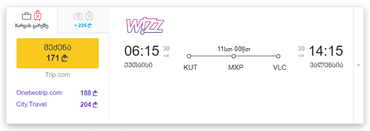 💡 ყურადღება: შესაძლოა ზემოთ მოცემული ფასების ცხრილი არ იყოს ბოლომდე განახლებული. KUT → VLC მიმართულებით მიმდინარე, ყველაზე იაფი ავიაბილეთების სანახავად, გთხოვთ გადახვიდეთ ამ ბმულზე →